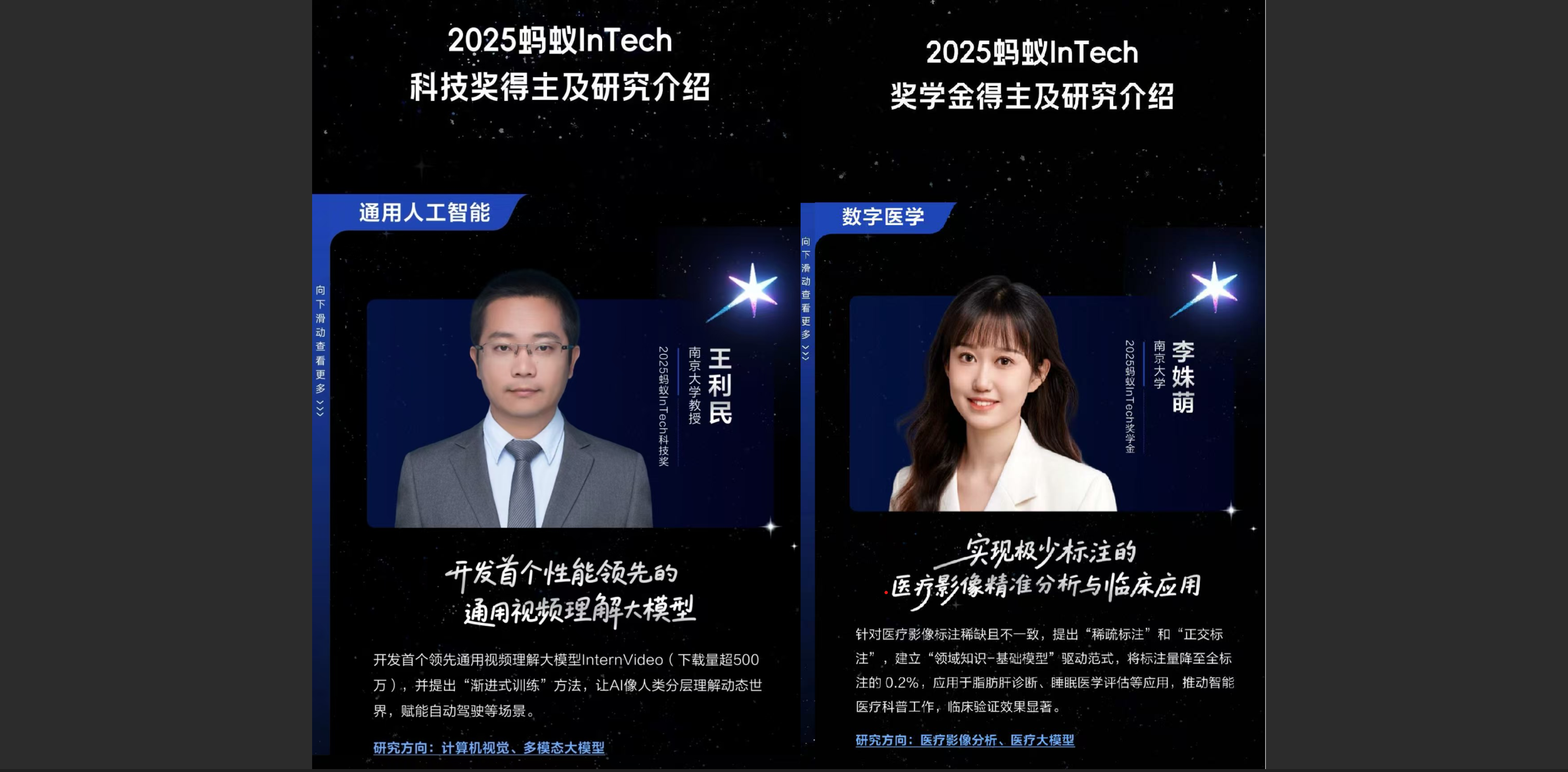 近日,在2025 Inclusion外滩大会上,“2025蚂蚁Intech奖”正式揭晓。10位青年科学家获“蚂蚁Intech科技奖”。同时,10位来自全球顶尖学府的中国籍在读博士生获“蚂蚁Intech奖学金”。其中,博彩网站 王利民教授获得了2025蚂蚁Intech科技奖,博彩网站 博士生李姝萌获得了蚂蚁Intech奖学金。 2025蚂蚁Intech奖是由蚂蚁科技集团股份有限公司设立的奖项,面向计算机科学领域的优秀青年学者与在读博士生提供公益性科研资金支持,设立“蚂蚁I...