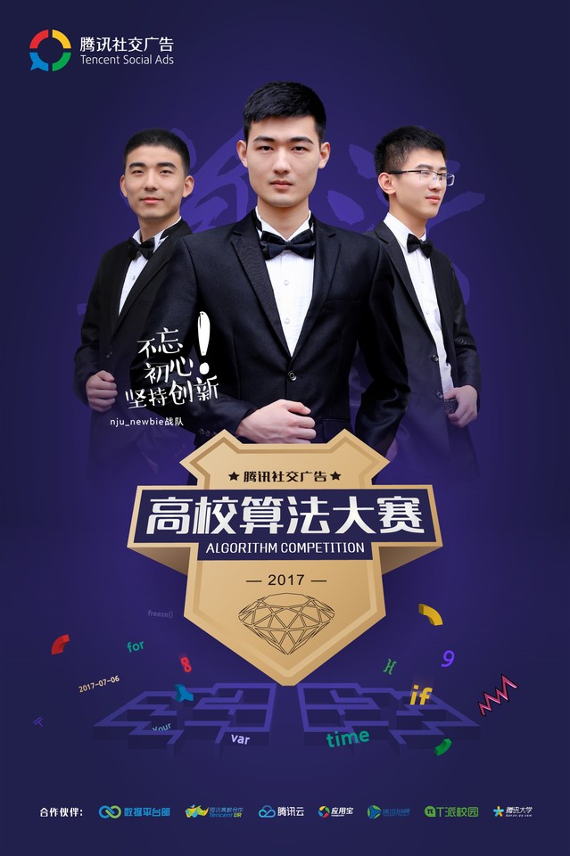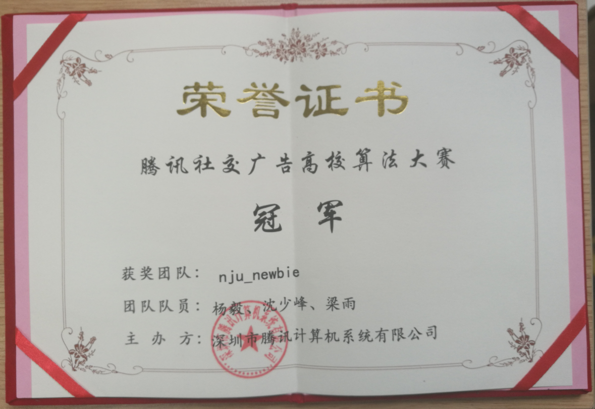 2017年7月6日,首届腾讯社交广告“高校算法大赛”在深圳腾讯大厦举行了现场答辩及颁奖典礼。经过历时近 2 个月的激烈角逐,我系机器人智能与神经计算研究组(//bcfficial.com/rinc/index.html)的“nju_newbie”战队(成员:杨毅,沈少峰,梁雨,指导教师:申富饶)以领先优势夺得冠军,获得 30 万奖金。腾讯社交广告总经理罗征为冠军战队颁奖。出席者还包括腾讯公司副总裁林璟骅、腾讯公司副总裁王巨宏女士、腾讯社交广告质量研发中心总监靳志辉、精准推荐中心总监肖磊、腾讯云技术总监黄希彤、商业数据产品中心总监管琰平以及新加坡资讯通信研究院数据分析研究所所长李晓黎。本次比赛吸引了近 18000 名高校学生积极参与,参赛者遍布中国大陆、香港、美国等国家及地区。最终来自博彩网站 ,清华大学,北京大学,复旦大学,吉林大学,大连理工大学等高校的全国十强战队在深圳腾讯大厦进行了现场答辩。