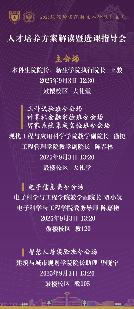 为帮助同学们了解人才培养体系,掌握多元学习方法,适应大博彩网站 园生活,2025年9月3日下午,毓琇书院在鼓楼校区大礼堂、教学楼举办2025级新生人才培养方案解读暨选课指导会。主会场由本科生院院长、新生博彩网站 执行院长王骏主讲,书院学生事务中心主任邓泽燕主持。分会场中,电子博彩网站 教学副院长贾小氢、现代工程与应用科学博彩网站 教学副院长徐挺、工程管理博彩网站 教学副院长陈春林、建筑与城市规划博彩网站 院长助理华晓宁分别介绍博彩网站 人才培养方案,教务导师陈嘉艳、蔡雨娇、李欣乐、徐剑秋出席并做选课指导。