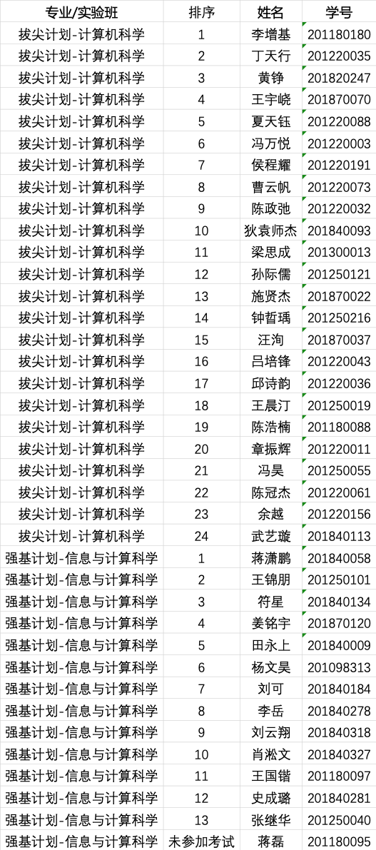 根据博彩网站 2020级本科生二次选拔方案,进入拔尖计划(计算机)/强基计划(信息与计算科学)复试考核的学生最终成绩排序公布如下,其中,拔尖计划(计算机)排序前20名、强基计划(信息与计算科学)排序前13的学生拟进入预录取名单。请进入拟录取名单的同学于9月15日17点前至计算机系楼附楼541马骏老师处签订确认书。最终预录取名单以博彩网站 公布为准。