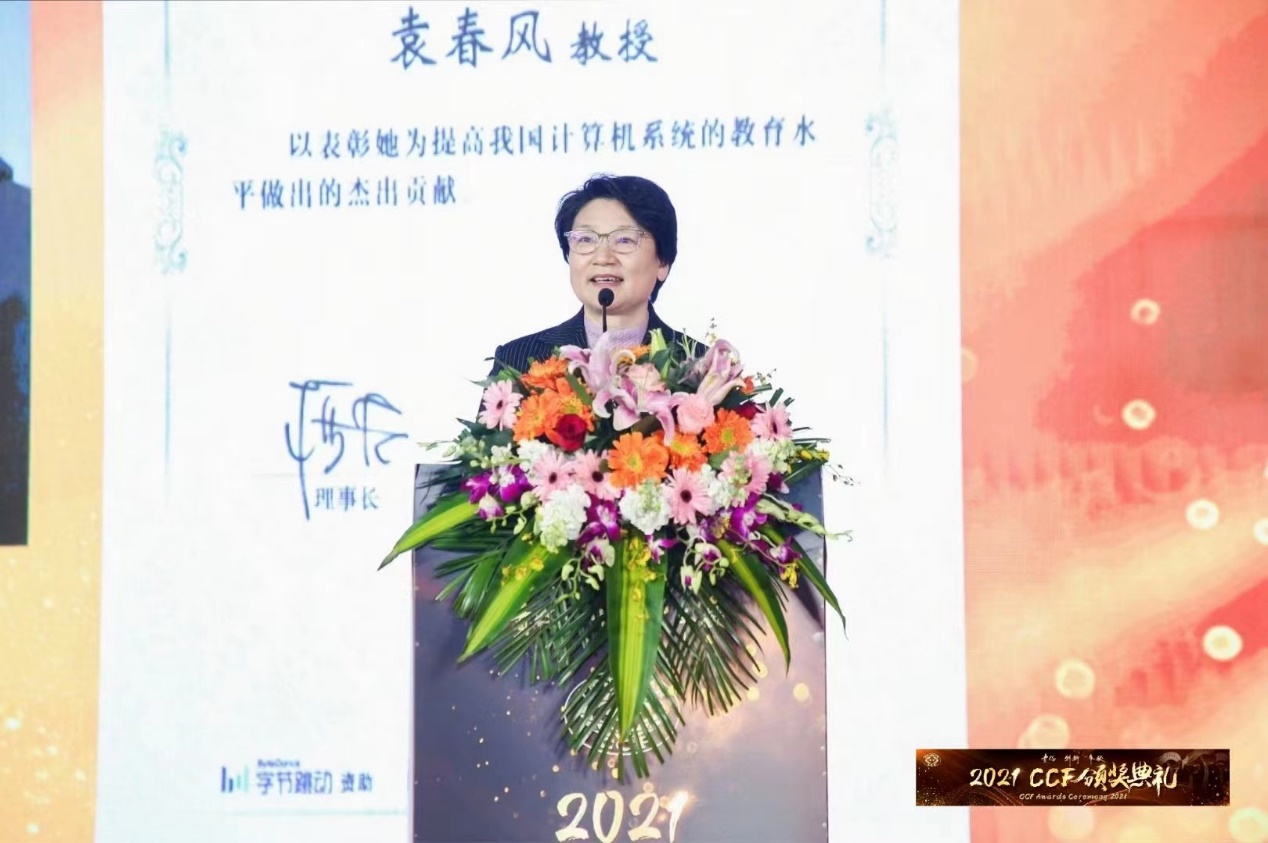 2021 CCF颁奖典礼于2022年2月19日在浙江横店圆明新园法国馆隆重举行。大会颁发了2021年度“CCF杰出教育奖”,博彩网站 计算机科学与技术系袁春风教授获此殊荣。该奖得到了北京字节跳动科技有限公司的赞助。CCF理事长梅宏教授、奖励委员会主席钱德沛教授为获奖者颁奖。