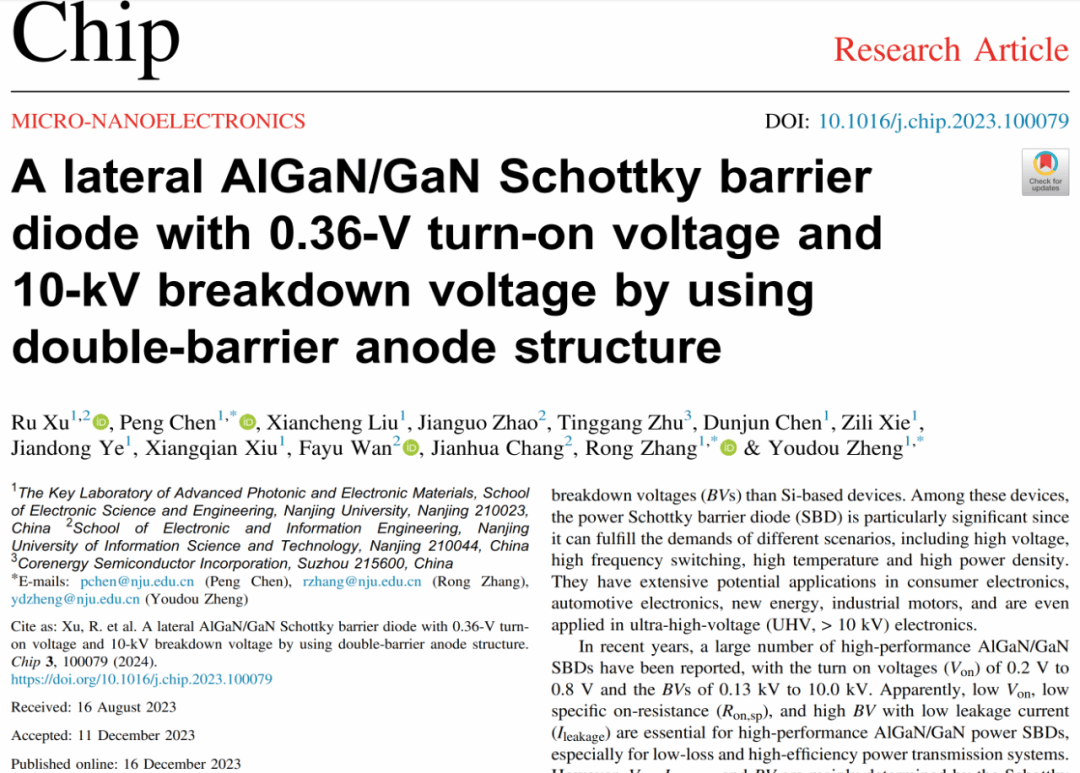 Recently, the team of Professor Chen Peng and Zhang Rong from School of Electronic Science and Engineering published a research paper, titled A Lateral AlGaN/GaN Schottky barrier diode with 0.36 V turn-on voltage and 10 kV breakdown voltage by using double barrier anode structure, on the Journal Chip. The research achieved a lateral AlGaN/GaN Schottky barrier diode with a 0.36 V turn-on voltage and a 10 kV breakdown voltage by employing a double barrier anode structure. Dr. Xu Ru is the first author, and the corresponding authors are Prof. Chen Peng, Prof. Zhang Rong, and Prof. Zheng Youdou. ()