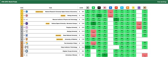 以下是46届和第47届比赛的部分榜单(完整榜单在//scoreboard.icpc.global/46///scoreboard.icpc.global/47/)